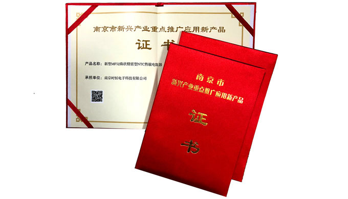 南京時恒電子科技有限公司的MF51E測溫型NTC熱敏電阻器、MF58玻殼精密NTC熱敏電阻器、新型MF52珠狀精密NTC熱敏電阻產品成功入選“2018年南京市新興產業重點推廣應用新產品認定評審名單”。。
