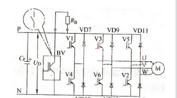 圖中,制動(dòng)單元BV的作用是:當(dāng)直流電壓UD超過(guò)一定限值時(shí),BV導(dǎo)通,使電容器通過(guò)制動(dòng)電阻RB放電;當(dāng)直流電壓UD降到限值以?xún)?nèi)時(shí),BV截止,停止放電。