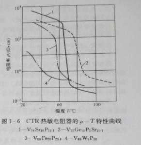 為滿足不同條件下的使用要求,通過對材料成分的調整便可得到不同溫度特性的CTR熱敏電阻。圖1-6給出了由一些不同材料制成的CTR熱敏電阻的溫度特性曲線。由于CTR熱敏電阻溫度特性存在劇變性,因而不能像NTC熱敏電阻那樣用于寬范圍的溫度控制,只能在特定的溫區內使用。