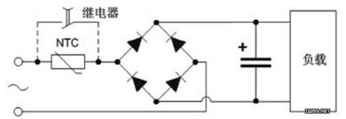 浪涌電流的抑制 浪涌電流的抑制方法有很多,一般中小功率電源中采用電阻限流的辦法抑制開機(jī)浪涌電流。圖2是一個(gè)常見的110V/220V雙輸入電源示意圖,以此為例,我們分析一下如何使用NTC熱敏電阻進(jìn)行浪涌電流的抑制。