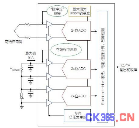 以前,RTD和檢測電阻器之間的比例式測量是用單個ADC執(zhí)行的。檢測電阻器的壓降用作測量RTD壓降的ADC之基準輸入。這種架構需要10 kΩ或更大的檢測電阻器,因此需要緩沖,以防止由ADC基準輸入動態(tài)電流導致的壓降。既然檢測電阻器的值至關重要,那么緩沖器就必須是低偏移、低漂移和低噪聲的。這種架構使電流源難以輪換,以消除寄生熱電偶效應。增量累加ADC的基準輸入更易于受到噪聲而不是輸入的影響,而且低基準電壓值可能導致不穩(wěn)定性。LTC2983的多ADC架構解決了所有這些問題(參見圖1)。LTC2983運用了兩個高度匹配、有緩沖和自動校準的ADC,一個用于RTD,另一個用于檢測電阻器。這些ADC同時測量RTD和Rsense,計算RTD電阻,并依據(jù)這些數(shù)據(jù)查一個基于ROM的表,最終以℃為單位輸出RTD溫度。
