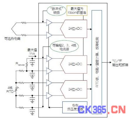 典型情況下,為了適應大阻值電阻,會使用電流非常小的激勵電流源和阻值較大的檢測電阻器。這導致在熱敏電阻器阻值范圍的低端,信號電平非常低。需要輸入緩沖器和基準緩沖器隔離ADC的動態(tài)輸入電流和這些較大的電阻器。但是如果沒有單獨的電源,緩沖器在靠近地時工作不是很好,而且需要最大限度減小偏移/噪聲誤差。LTC2983解決了所有這些問題(參見圖2)。該器件整合了一個連續(xù)校準的專有緩沖器和多ADC架構,該緩沖器能夠在地電平甚至在低于地電平時對信號進行數(shù)字化。兩個匹配的緩沖ADC同時測量熱敏電阻器和檢測電阻器,計算(基于標準)熱敏電阻器的溫度,并以℃為單位報告結果。不需要大阻值檢測電阻器,從而允許多個RTD和不同類型的熱敏電阻器共用單一檢測電阻器。LTC2983還可以視熱敏電阻器輸出電阻的不同,而自動設定不同的激勵電流范圍。